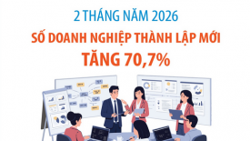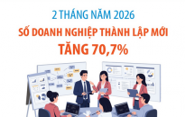 Số doanh nghiệp thành lập mới tăng 70,7% sau 2 tháng năm 20262 tháng năm 2026, cả nước có gần 35,5 nghìn doanh nghiệp đăng ký thành lập mới với tổng số vốn đăng ký gần 313,7 nghìn tỷ đồng và tổng số lao động đăng ký hơn 167,5 nghìn lao động, tăng 70,7% về số doanh nghiệp, tăng 36,1% về vốn đăng ký và tăng 19,1% về số lao động so với cùng kỳ năm trước. -