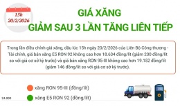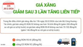 Giá xăng giảm sau 3 lần tăng liên tiếpTrong lần điều chỉnh giá xăng, dầu lúc 15h ngày 20/2/2026 của Liên Bộ Công thương - Tài chính, giá bán xăng E5 RON 92 không cao hơn 18.634 đồng/lít (giảm 200 đồng/lít so với giá cơ sở kỳ trước) và giá bán xăng RON 95-III không cao hơn 19.152 đồng/lít (giảm 146 đồng/lít so với giá cơ sở kỳ trước). -