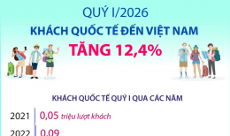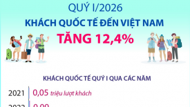 Khách quốc tế đến Việt Nam tăng 12,4% trong quý I/2026Tính chung quý I/2026, khách quốc tế đến Việt Nam đạt 6,76 triệu lượt người, tăng 12,4% so với cùng kỳ năm trước và là mức cao nhất của quý I các năm từ trước đến nay. -