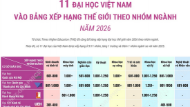 Điểm tên 11 đại học Việt Nam vào bảng xếp hạng thế giới năm 2026 theo nhóm ngànhTổ chức Times Higher Education (THE) đã công bố bảng xếp hạng đại học thế giới năm 2026 theo nhóm ngành. Theo đó, có 11 đại học của Việt Nam được xếp hạng ở 9/11 nhóm, tăng 1 trường và thêm 1 nhóm ngành so với năm 2025. -