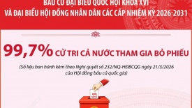 Bầu cử Quốc hội và HĐND: Có 99,70% cử tri cả nước tham gia bỏ phiếuCuộc bầu cử ngày 15/3/2026 cả nước có 76.423.940 cử tri. Gần 76,2 triệu cử tri tham gia bỏ phiếu, đạt tỷ lệ 99,70% và không có đơn vị nào phải tổ chức bầu lại. Tổng số người trúng cử đại biểu Quốc hội là 500 người. -
