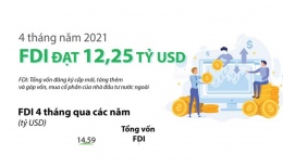 Vốn đầu tư nước ngoài vào Việt Nam đạt 12,25 tỷ USDTrong 4 tháng đầu năm, tổng vốn đầu tư nước ngoài vào Việt Nam đạt 12,25 tỷ USD, bằng 99,3% so với cùng kỳ năm 2020.