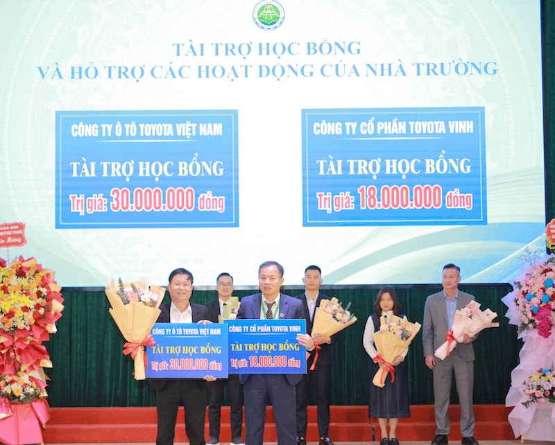 | Đại lý Toyota Vinh, Toyota Quảng Bình và Toyota Sông Lam trao tặng 8 suất học bổng với tổng giá trị 48 triệu đồng cho các sinh viên. |