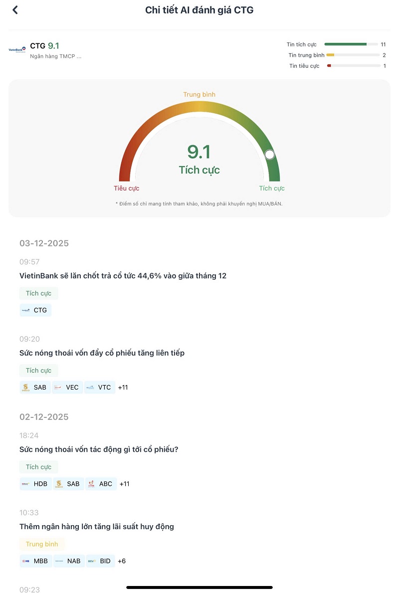 AI News giúp người dùng tổng hợp tin tức thị trường nhanh chóng từ nhiều nguồn tin uy tín, phân loại thông tin liên quan đến mã chứng khoán theo các sắc thái: tích cực, trung bình, tiêu cực.