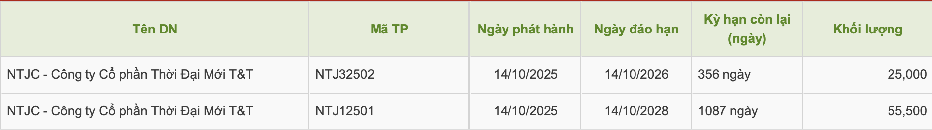 Cụ thể, Thời đại mới T&T phát hành 55.500 trái phiếu trong ngày 14/10/2025. Với mệnh giá 100 triệu đồng/trái phiếu, công ty này huy động được 5.500 tỷ đồng từ đợt phát hành này.