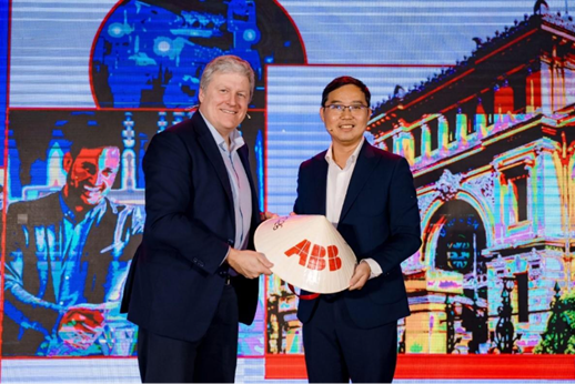 | Craig McDonell, Giám đốc Điều hành Khối Công nghiệp, ABB Robotics, và Khang Trần, Giám đốc ABB Robotics Việt Nam, cùng tôn vinh bản sắc địa phương và tinh thần hợp tác toàn cầu với chiếc nón lá truyền thống của Việt Nam. |