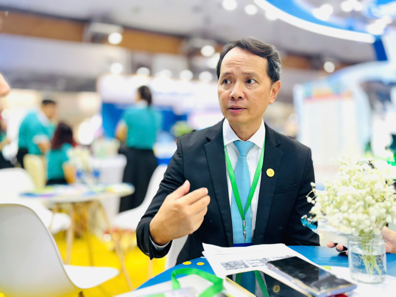 | Ông Trần Thế Dũng, Tổng Giám đốc Vietluxtour chia sẻ thông tin với phóng viên tại gian hàng Vietluxtour. Ảnh: Hồ Hạ |