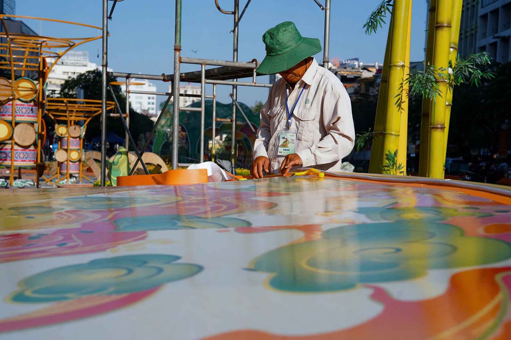 Trước giờ khai mạc đường hoa Nguyễn Huệ Tết Bính Ngọ, không khí thi công trở nên khẩn trương. Dưới ánh nắng, các tổ thợ tất bật lắp đặt linh vật ngựa, chỉnh sửa tiểu cảnh, hoàn thiện từng chi tiết trang trí cuối cùng.