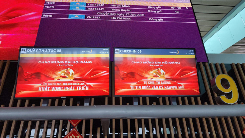 | Màn hình LED khổng lồ đặt trước giữa Quảng trường Kiss Square chiếu hình cờ Tổ Quốc và những khẩu hiệu ý nghĩa hưởng ứng Đại hội đại biểu lần thứ XIV của Đảng, thu hút sự chú ý của đông đảo du khách trong nước và quốc tế. |