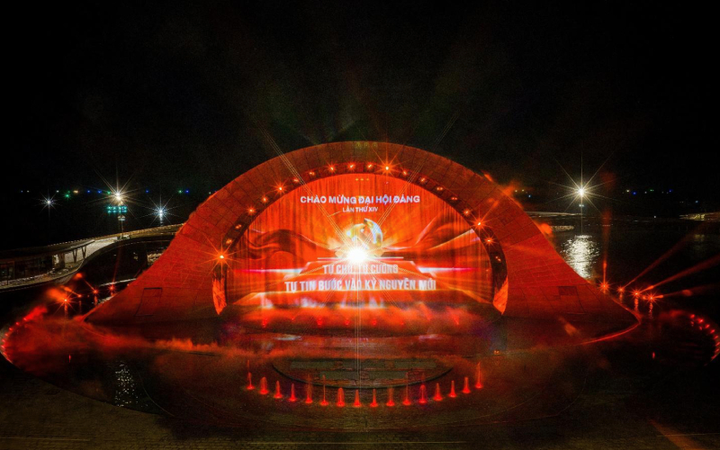 | Màn hình lớn của show “Kiss of The Sea” dịp này cũng trang trọng thể hiện tinh thần chào mừng Đại hội Đảng lần thứ XIV. |