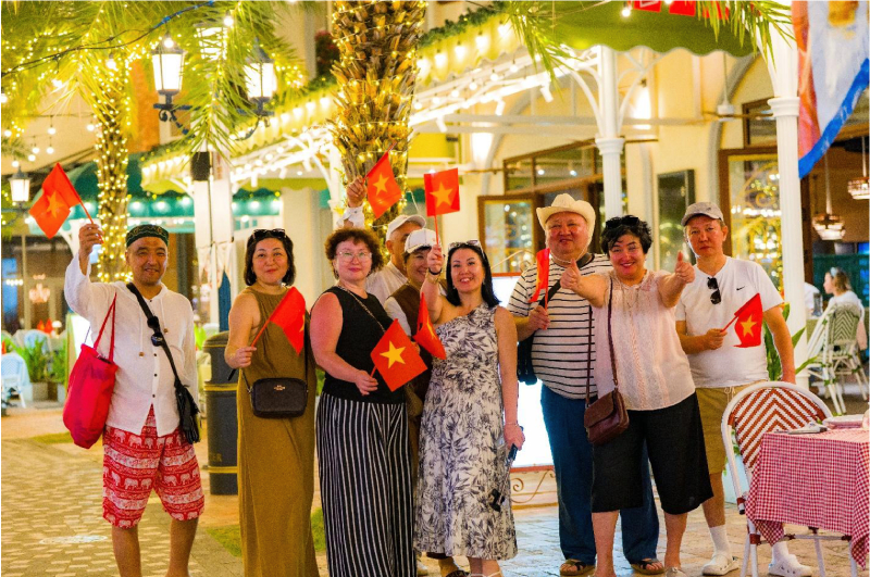 | Du khách quốc tế vô cùng hào hứng với khung cảnh cờ hoa ngợp ngời tại Thị trấn Hoàng Hôn (Phú Quốc) trong những ngày này. |