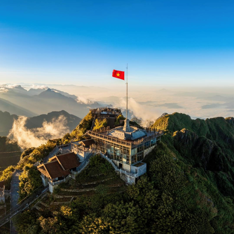 | Tại Sa Pa, cờ Tổ Quốc đỏ thắm ngạo nghễ tung bay trên đỉnh thiêng Fansipan, biểu tượng cho niềm tự hào của dân tộc Việt Nam chào mừng sự kiện chính trị quy mô lớn của đất nước. |