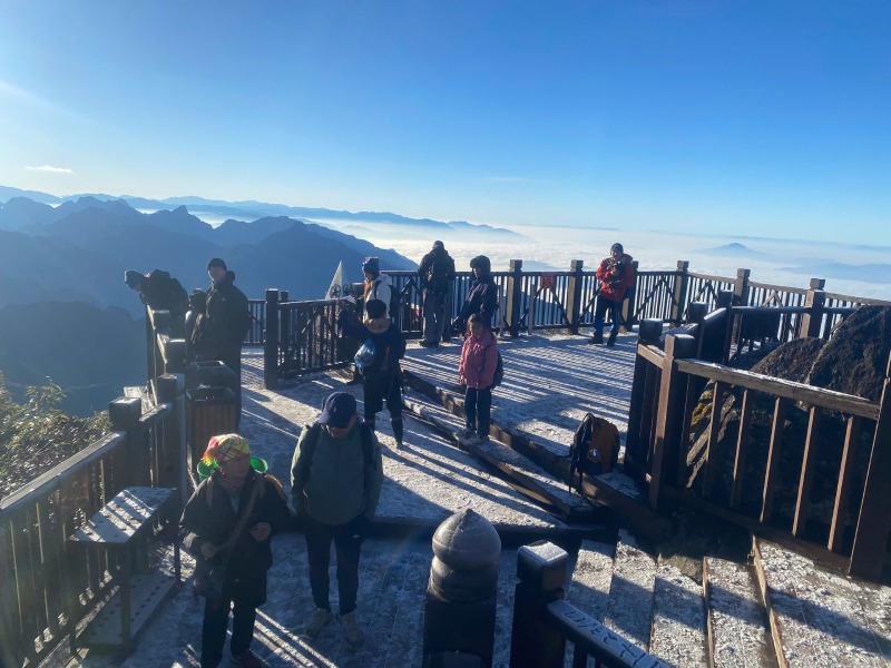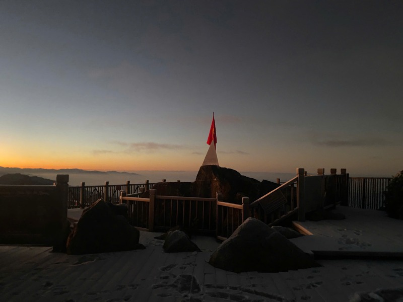Từ cao độ khoảng 3.143m, du khách đã bắt gặp tuyết rơi nhẹ, bám thành lớp mỏng trên cây cối, lan can và các công trình trên đỉnh. Nhiều người hào hứng ghi lại khoảnh khắc khi mặt sàn gỗ, lối đi và các góc check-in quen thuộc đều phủ trắng trong buổi sớm.