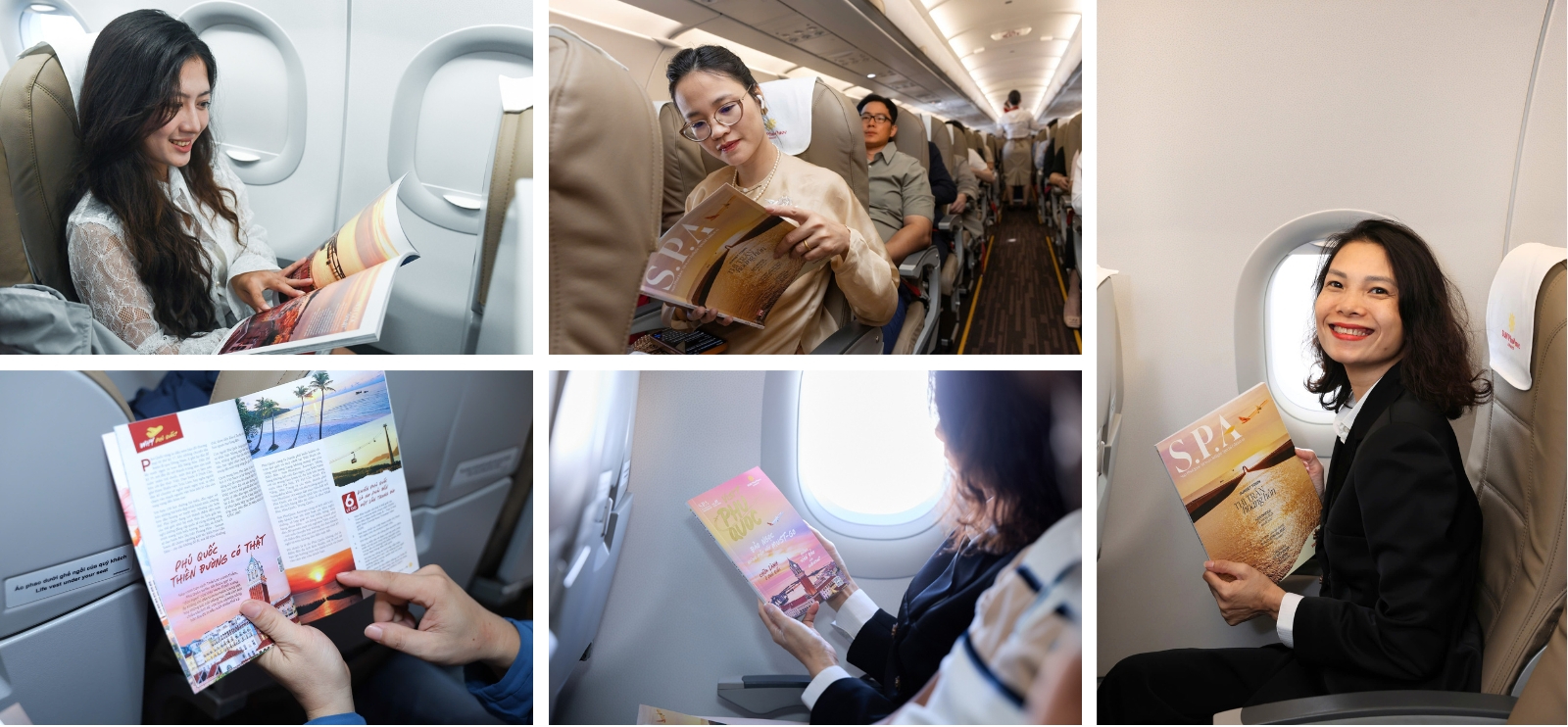 Trên tay mỗi hành khách là ấn phẩm song ngữ S.P.A Magazine và Visit Phu Quoc. Những trang in bóng loáng mở ra thế giới của du lịch, văn hóa và phong cách sống, cũng chính là cách Sun PhuQuoc Airways kể câu chuyện của mình: bay không chỉ là đến nơi, mà là đi qua những hành trình có câu chuyện.