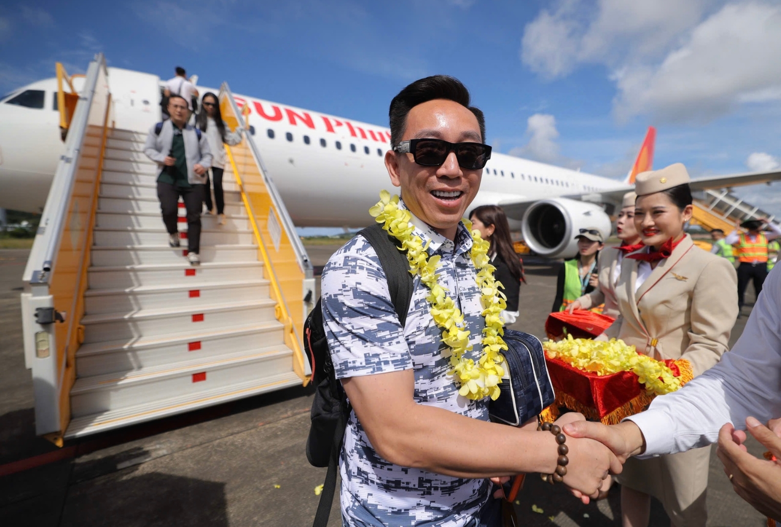 Cửa mở. Gió biển ùa vào. Hành khách bước xuống thang máy bay, mỗi người được tặng một tràng hoa lan vàng óng, thơm nhẹ và những nụ cười chào đón. Họ đi qua dải thảm đỏ đặt vội, hướng đến khu vực sân bay Phú Quốc, nơi ban tổ chức đứng xếp hàng, ánh mắt ai cũng long lanh vì niềm tự hào.