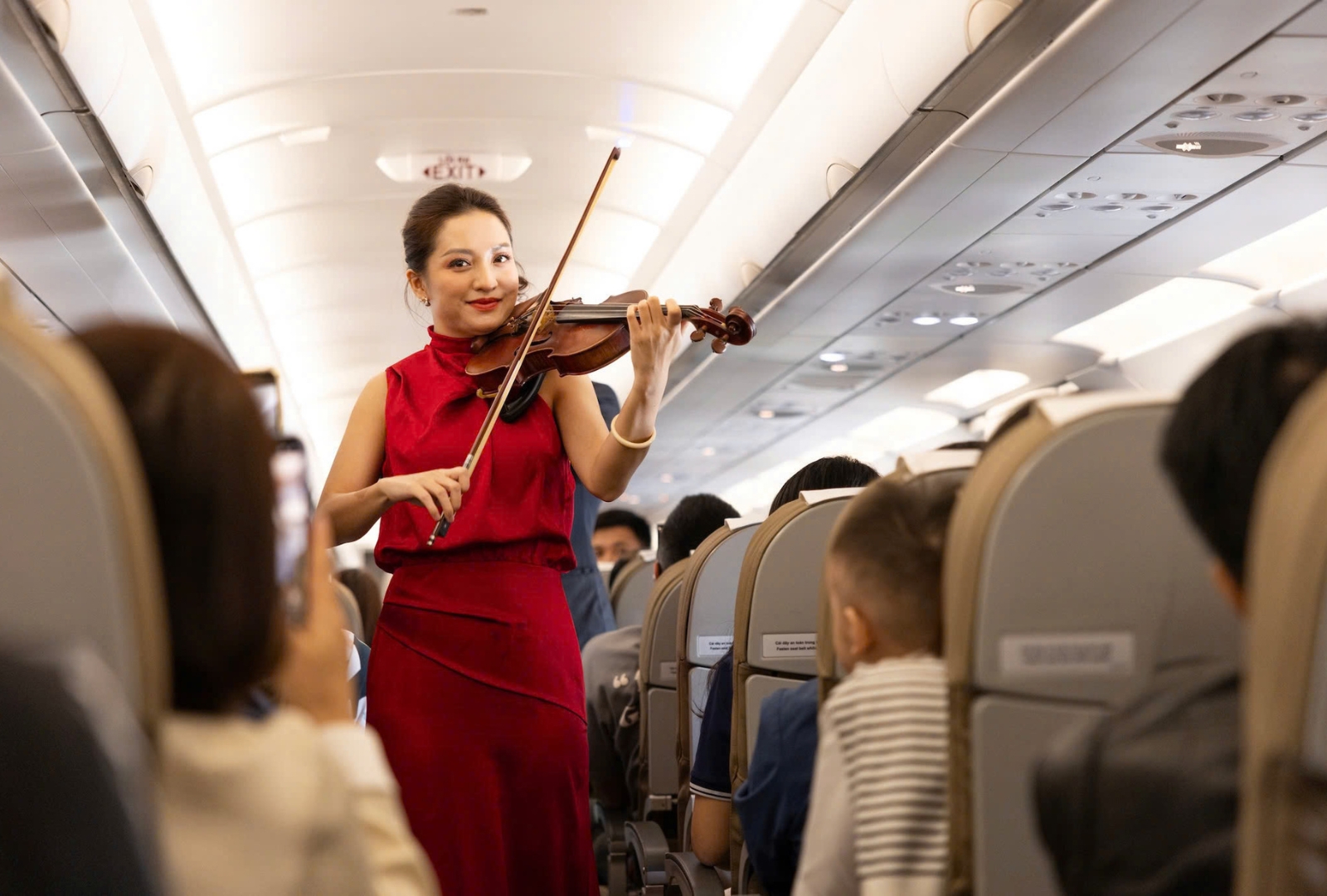 Giữa không trung, tiếng đàn violin mềm mại vang lên. Không khí khoang bay bỗng lặng đi một chút, không ai nói gì, chỉ có những nụ cười. Đó là món quà bất ngờ của chuyến bay đầu tiên: một bản nhạc giữa tầng mây, khơi gợi cảm xúc yên bình và niềm vui giản dị.