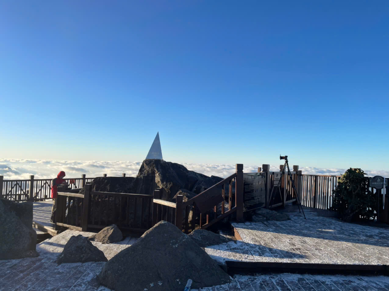 7h30 sáng, mặt trời lên cao, băng tan dần còn lại lớp mỏng bám trên khu vực đỉnh và sàn cột cờ tổ quốc.