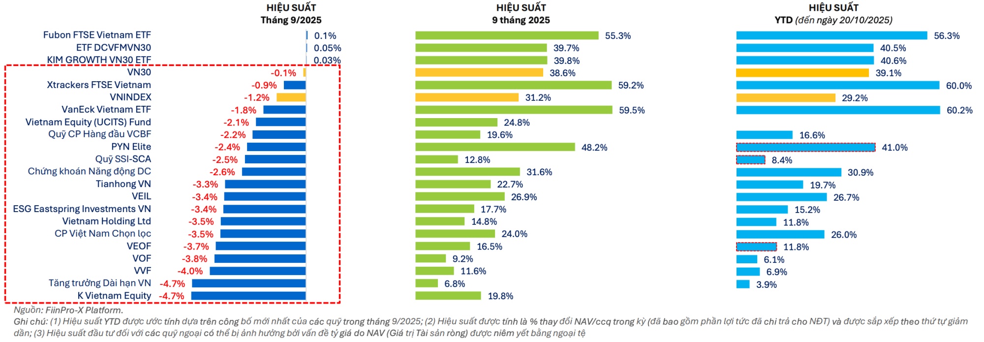 Ở chiều ngược lại, nhóm có hiệu suất vượt trội là PYN Elite, VanEck Vietnam ETF, Xtrackers FTSE Vietnam. Top nắm giữ của các quỹ này là các cổ phiếu thuộc nhóm Vingroup hay GELEX. Bên cạnh đó, mức tăng trưởng cao này còn được cộng hưởng bởi yếu tố tỷ giá (khi tỷ giá EUR/VND tăng +16,5% và tỷ giá USD/VND tăng +3,5% kể từ đầu năm 2025).