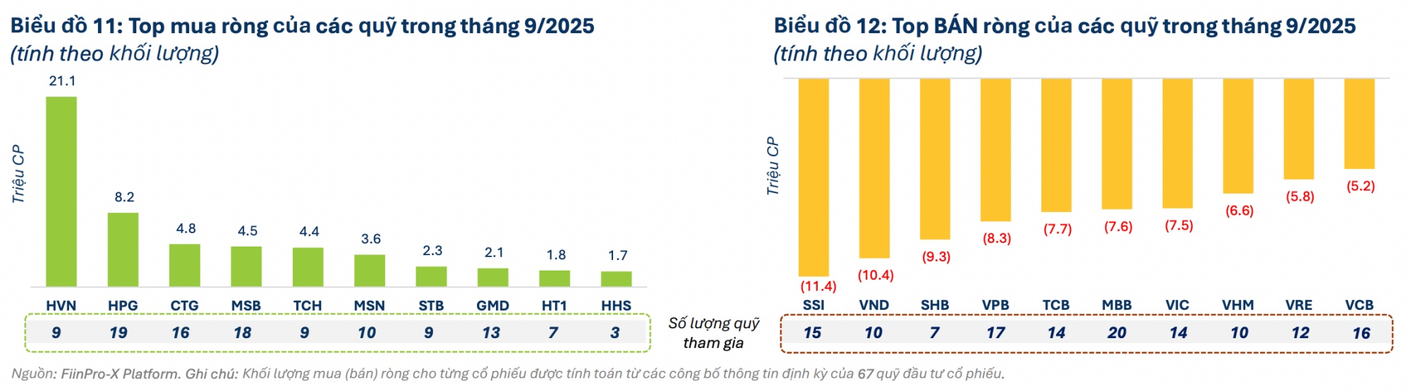 Trong tháng 9/2025, HVN đứng đầu danh sách cổ phiếu được các quỹ mua ròng theo khối lượng. Lực mua vào phần lớn đến từ quỹ ngoại PYN Elite với kỳ vọng HVN dự kiến sẽ niêm yết công ty con Skypec vào năm 2027. HPG tiếp tục nằm trong top cổ phiếu được mua ròng và đồng thời có nhiều quỹ tham gia mua vào nhất (19 quỹ). Trong đó, đáng chú ý là các quỹ thuộc Dragon Capital như VEIL, VFMVSF, DCDS. Nhóm ngân hàng quy mô nhỏ như MSB, STB, OCB cũng được mua ròng tích cực trong tháng 9/2025. Hai cổ phiếu OCB và STB đều được quỹ PYN Elite tăng tỷ trọng nắm giữ 2 tháng liên tiếp.