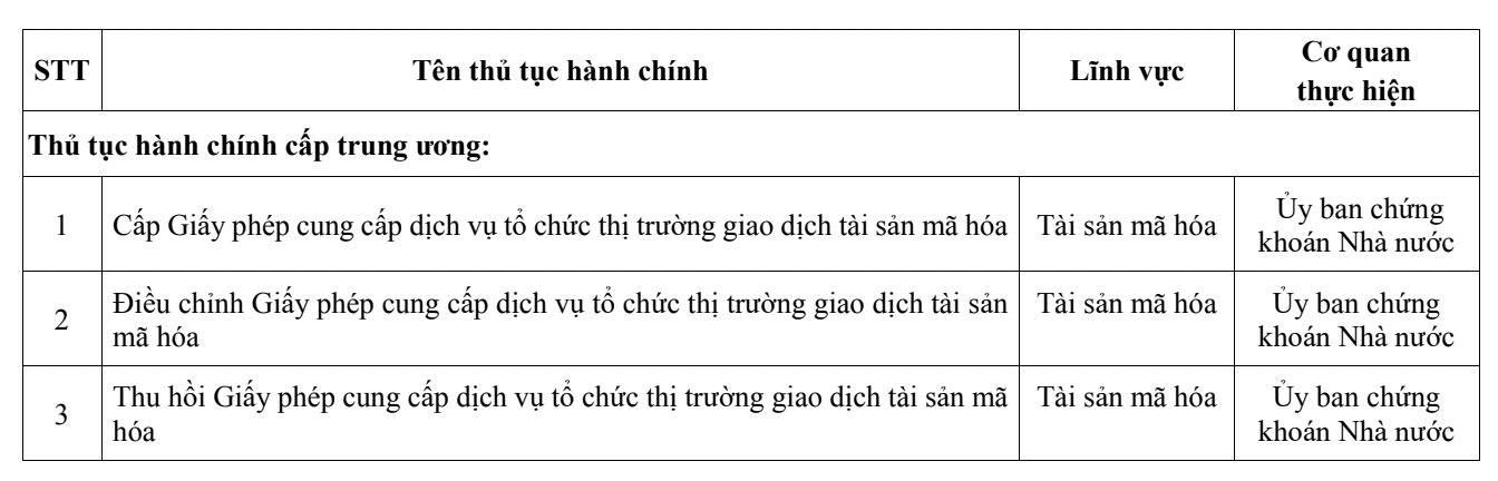 Theo Quyết định, 3 thủ tục hành chính mới được ban hành trong lĩnh vực tài sản mã hóa thuộc phạm vi chức năng quản lý của Bộ Tài chính bao gồm: Cấp Giấy phép cung cấp dịch vụ tổ chức thị trường giao dịch tài sản mã hóa; Điều chỉnh Giấy phép cung cấp dịch vụ tổ chức thị trường giao dịch tài sản mã hóa; Thu hồi Giấy phép cung cấp dịch vụ tổ chức thị trường giao dịch tài sản mã hóa.