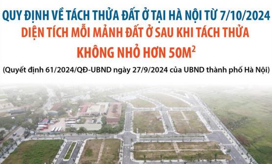 Từ 7/10/2024, Hà Nội áp dụng quy định mới về diện tích đất ở tối thiểu để được tách thửa. Theo đó, đất ở nằm trên địa bàn các phường, thị trấn để được tách thửa thì diện tích không nhỏ hơn 50 m2, chiều dài trên 4 m và chiều rộng giáp đường giao thông từ 4 m trở lên...