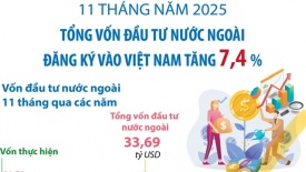 Tổng vốn đầu tư nước ngoài đăng ký vào Việt Nam tăng 7,4% sau 11 tháng năm 202511 tháng năm 2025, tổng vốn đầu tư nước ngoài đăng ký vào Việt Nam tính đến ngày 30/11/2025 bao gồm: Vốn đăng ký cấp mới, vốn đăng ký điều chỉnh và giá trị góp vốn, mua cổ phần của nhà đầu tư nước ngoài đạt 33,69 tỷ USD, tăng 7,4% so với cùng kỳ năm trước. -