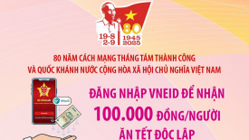 Người dân đăng nhập VNeID để nhận 100.000 đồng/người ăn Tết Độc lậpTheo Công điện của Thủ tướng về việc tặng quà người dân nhân dịp kỷ niệm 80 năm Cách mạng Tháng Tám và Quốc khánh 2/9, công dân Việt Nam được tặng 100.000 đồng/người ăn Tết Độc lập. Bộ Công an đã thực hiện triển khai dịch vụ liên kết tài khoản nhận chi trả an sinh xã hội cho người dân theo chính sách của Đảng và Nhà nước trên ứng dụng VneID. -