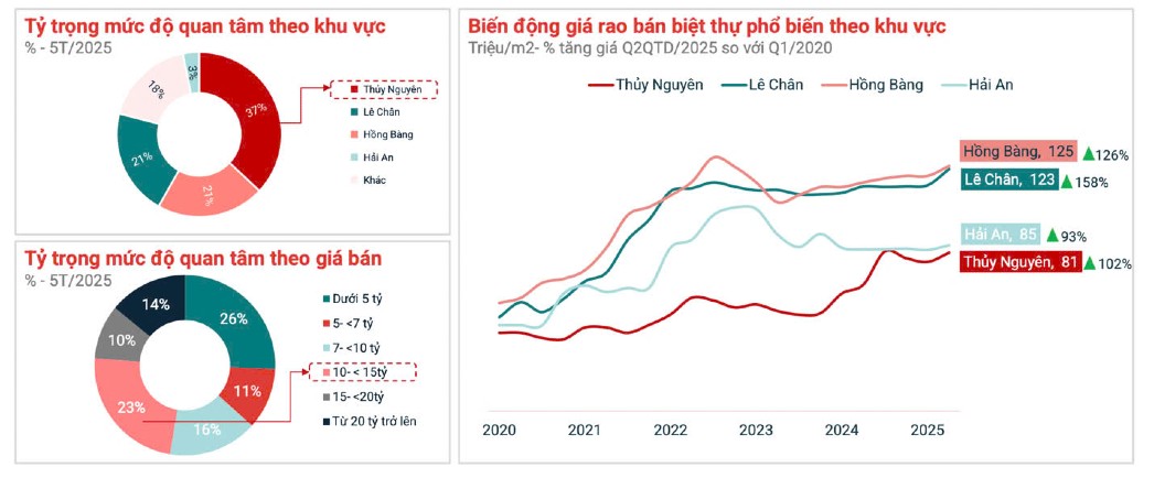 Củng cố nhận định này, thống kê dữ liệu của Hội Môi giới Bất động sản Việt Nam (VARS) cho thấy, kể từ tháng 3/2025, thị trường BĐS Hải Phòng trở nên sôi động khi hàng loạt dự án mới đồng loạt ra mắt. Trong 6 tháng đầu năm 2025, toàn thị trường ghi nhận khoảng 7.000 sản phẩm mở bán, tăng hơn 22% so với cùng kỳ năm 2024. Tỷ lệ hấp thụ đạt trên 60%, tương đương hơn 4.200 giao dịch thành công, tăng hơn 30% so với cùng kỳ. Riêng phân khúc biệt thự, Thủy Nguyên dẫn đầu về biên độ tăng giá, với chỉ số giá tăng 102% so với Quý I/2020.