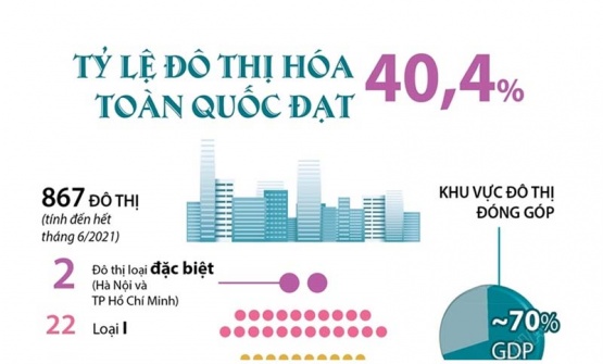 Tính đến hết tháng 6 năm 2021, cả nước có 867 đô thị. Tỷ lệ đô thị hóa ước đạt khoảng 40,4%.