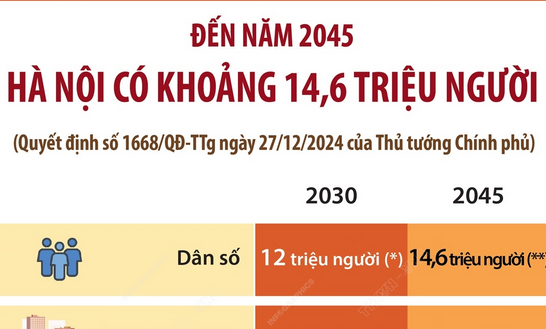 Theo Quyết định số 1668/QĐ-TTg, ngày 27/12/2024 của Thủ tướng Chính phủ phê duyệt Điều chỉnh Quy hoạch chung Thủ đô Hà Nội đến năm 2045, tầm nhìn đến năm 2065, dự báo dân số của Thủ đô Hà Nội đến năm 2030 là 12 triệu người và đến năm 2045 tăng lên 14,6 triệu người.
