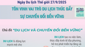 Ngày Du lịch Thế giới 2025: Du lịch thúc đẩy sự chuyển đổi bền vữngNgày Du lịch Thế giới là sự kiện quan trọng hàng đầu của ngành du lịch toàn cầu, được tổ chức vào ngày 27/9 hằng năm. Năm 2025 chủ đề Ngày Du lịch Thế giới được lựa chọn là “Du lịch và Chuyển đổi bền vững” nhấn mạnh tiềm năng của du lịch như một tác nhân thúc đẩy sự thay đổi tích cực.
