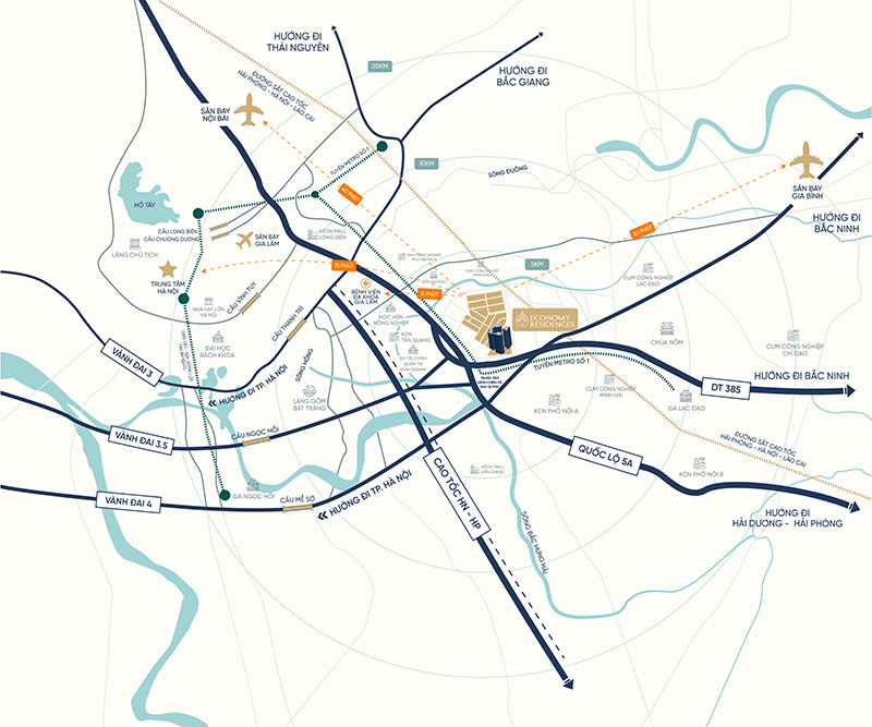 Được quy hoạch tại trung tâm khu vực Như Quỳnh - cửa ngõ phía Đông Thủ đô, Economy Residences chỉ cách Hồ Gươm khoảng 15 phút di chuyển, kết nối trực tiếp với các trục giao thông chiến lược như Vành đai 3.5, Vành đai 4, Quốc lộ 5A và tuyến cao tốc - Metro Hà Nội - Hải Phòng - Lào Cai.