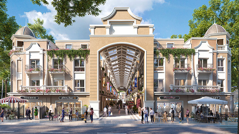 | Shophouse hai mặt tiền kết hợp phố đi bộ có mái che bao gồm 2 khối được nối với nhau bằng mái ngói kết hợp kính giúp tận dụng ánh sáng ban ngày và thông gió tự nhiên, ban đêm được chiếu sáng bằng điện năng lượng mặt trời. |