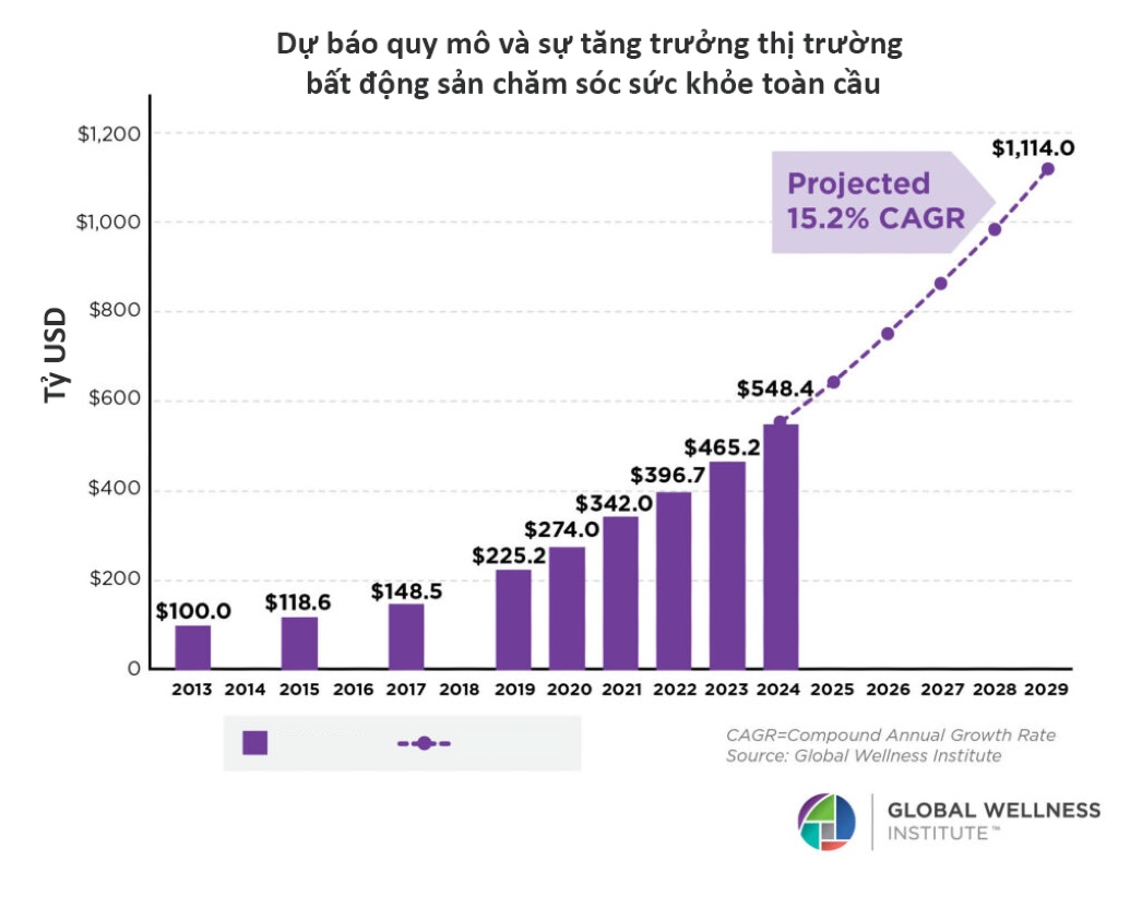 Theo Báo cáo “Giám sát Nền kinh tế Sức khỏe Toàn cầu 2024” của Viện Sức khỏe Toàn cầu (GWI), bất động sản chăm sóc sức khỏe hiện trị giá 6.300 tỷ USD và là phân khúc tăng trưởng nhanh nhất trong nền kinh tế sức khỏe. Động lực tăng trưởng đến từ nhóm dân số trung niên và cao tuổi – những người cần không gian sống an toàn, giảm stress và hỗ trợ điều trị.