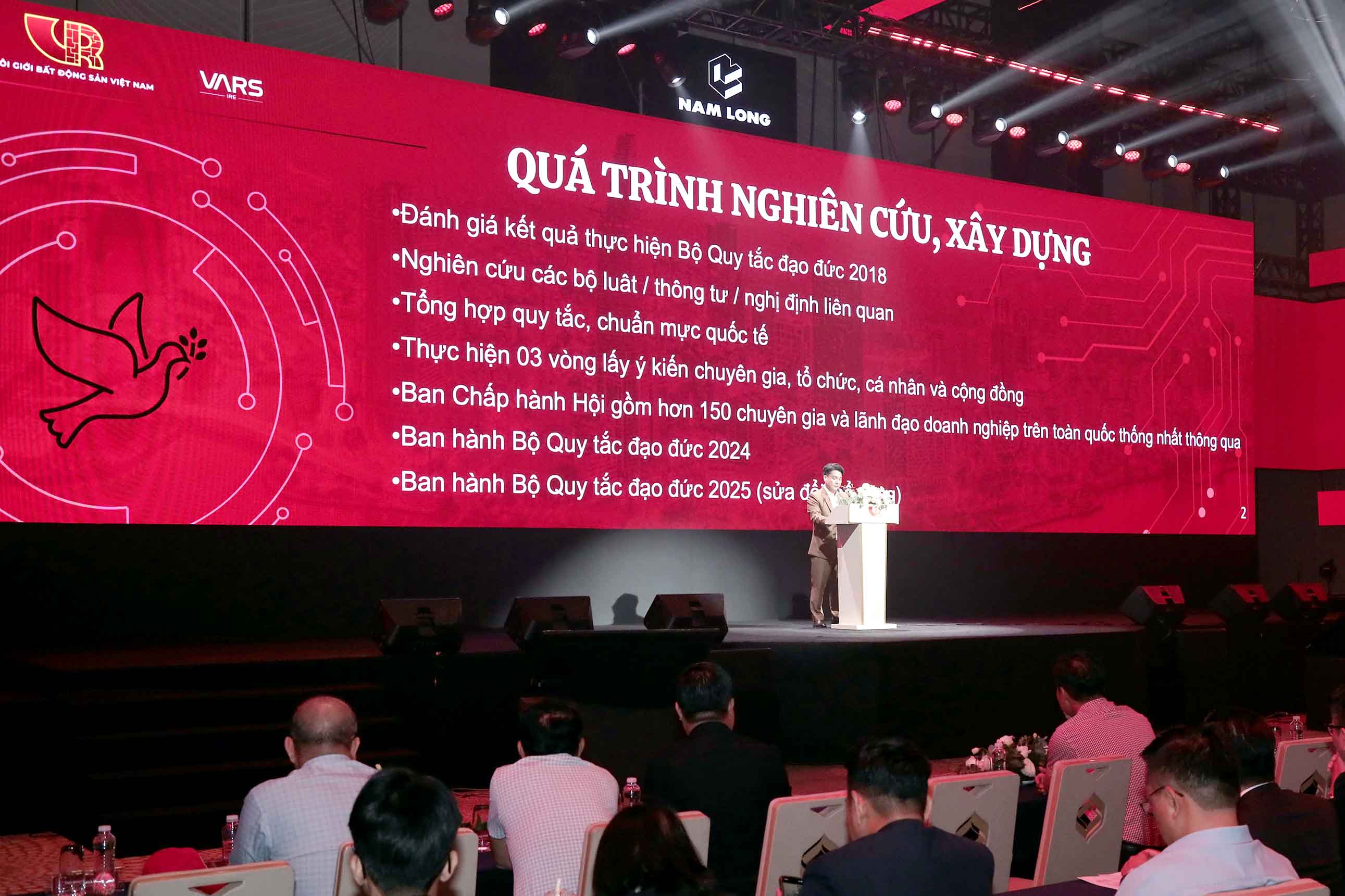 | Đại diện VARS công bố Quy chế đánh giá và công nhận đạt chuẩn theo Bộ quy tắc đạo đức và ứng xử nghề nghiệp Môi giới Bất động sản Việt Nam VPEC 2025. |