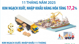 Kim ngạch xuất, nhập khẩu hàng hóa tăng 17,2% tăng 11 tháng năm 202511 tháng năm 2025, tổng kim ngạch xuất, nhập khẩu hàng hóa đạt 839,75 tỷ USD, tăng 17,2% so với cùng kỳ năm trước, trong đó xuất khẩu tăng 16,1%; nhập khẩu tăng 18,4%. Cán cân thương mại hàng hóa xuất siêu 20,53 tỷ USD. -