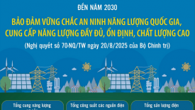 Đến năm 2030: Bảo đảm vững chắc an ninh năng lượng quốc gia, cung cấp năng lượng đầy đủ, ổn định, chất lượng caoNghị quyết số 70-NQ/TW ngày 20/8/2025 của Bộ Chính trị nêu rõ, để đáp ứng yêu cầu phát triển nhanh và bền vững đất nước trong thời gian tới, nhất là thực hiện 2 mục tiêu chiến lược đến năm 2030 và năm 2045, công tác bảo đảm an ninh năng lượng có vai trò rất quan trọng, năng lượng phải đi trước một bước, đáp ứng đầy đủ nhu cầu phát triển kinh tế - xã hội, quốc phòng, an ninh và nâng cao đời sống nhân dân. -