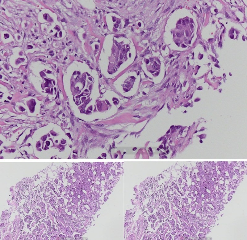 Kết quả mô bệnh học thường quy với nhuộm Hematoxylin Eosin xác định bệnh nhân mắc carcinoma tuyến vú thể ống xâm nhập, độ mô học II. Nhằm đánh giá tiên lượng và xây dựng phác đồ điều trị tối ưu, các bác sỹ tiếp tục thực hiện xét nghiệm hóa mô miễn dịch với bốn dấu ấn ER, PR, HER2 và Ki 67.