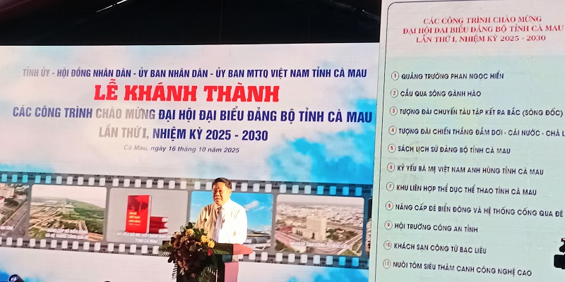 Chiều 16/10/2025, trong khuôn khổ các sự kiện chào mừng Đại hội Đại biểu Đảng bộ tỉnh Cà Mau lần thứ I, nhiệm kỳ 2025-2030, tỉnh Cà Mau tổ chức Lễ khánh thành 11 công trình, dự án chào mừng sự kiện này với tổng vốn đầu tư trên 2.676 tỷ đồng.