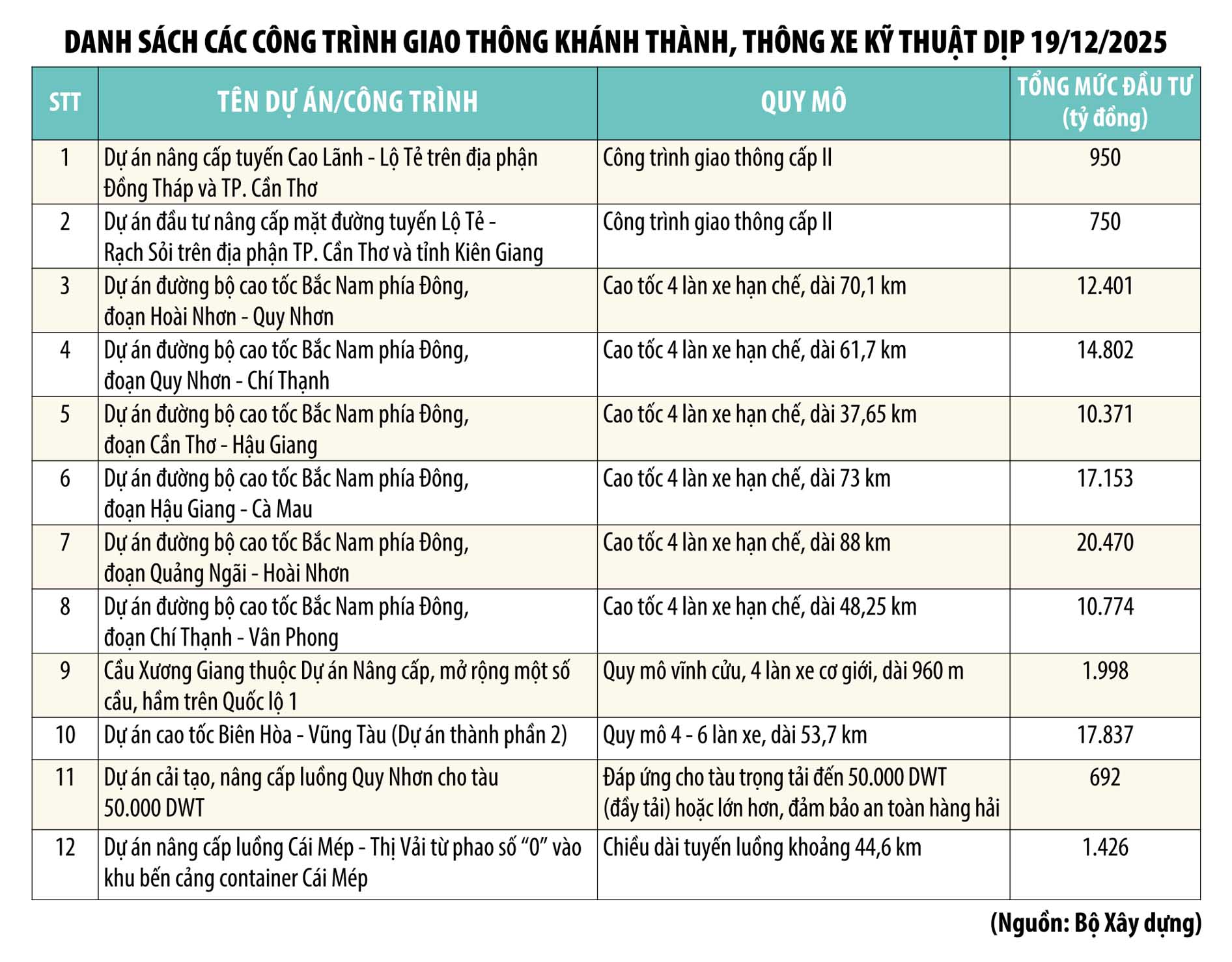 Đối với các dự án hạ tầng giao thông do Bộ Xây dựng làm chủ quản đầu tư, vào cuối tuần trước, Bộ đã báo cáo Thủ tướng Chính phủ danh mục các công trình khánh thành, khởi công chào mừng Đại hội đại biểu toàn quốc lần thứ XIV của Đảng dịp 19/12/2025.