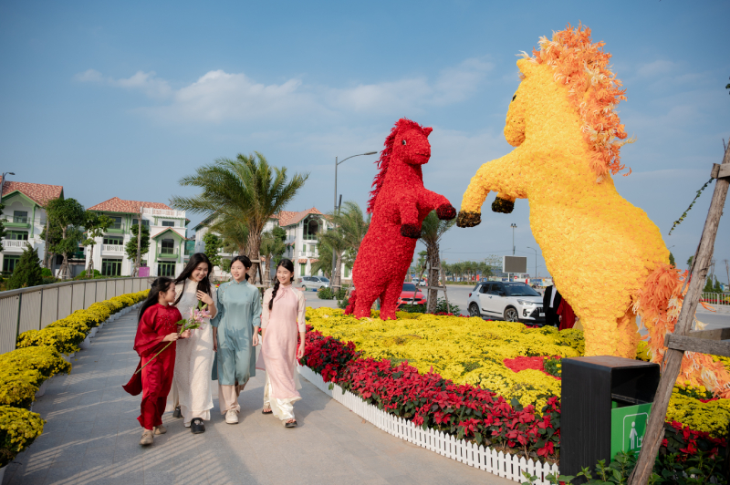 Đặc biệt, dịp này, Quảng trường Thời đại đã trở thành đại lộ hoa đầy ấn tượng, cảnh quan được trang hoàng vô cùng ấn tượng và xinh đẹp. Sự xuất hiện của những thảm hoa, tiểu cảnh đủ màu sắc và hai cặp linh vật “Song mã nghênh xuân” được bố trí gần khu vực mô hình Trống Đọi Tam khổng lồ đã trở thành bối cảnh check in hot hit, thu hút đông đảo du khách và người dân đến chiêm ngưỡng và chụp ảnh.