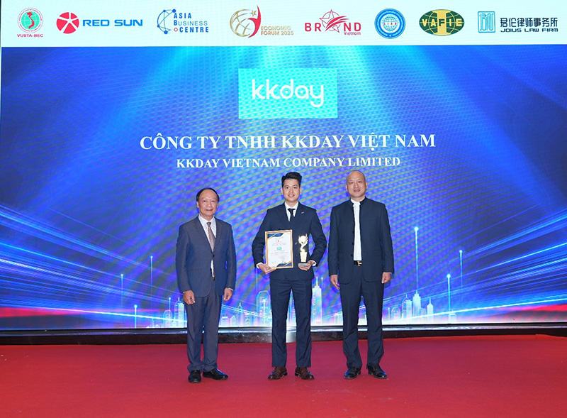 | Ông Nguyễn Gia Phú Thuận đại diện Công Ty TNHH KKday Việt Nam (giữa) nhận chứng nhận Top 10 Doanh nghiệp xuất sắc châu Á - Thái Bình Dương tại Thượng Hải. Ảnh: Văn Phú |