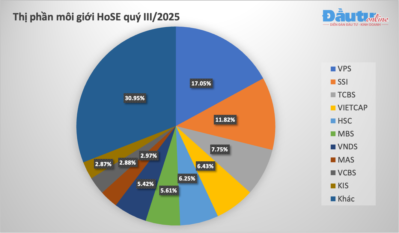 Tính chung, thị phần của 10 công ty chứng khoán trên đạt 69,05% trong quý III/2025, tăng so với mức 68,49% quý trước.