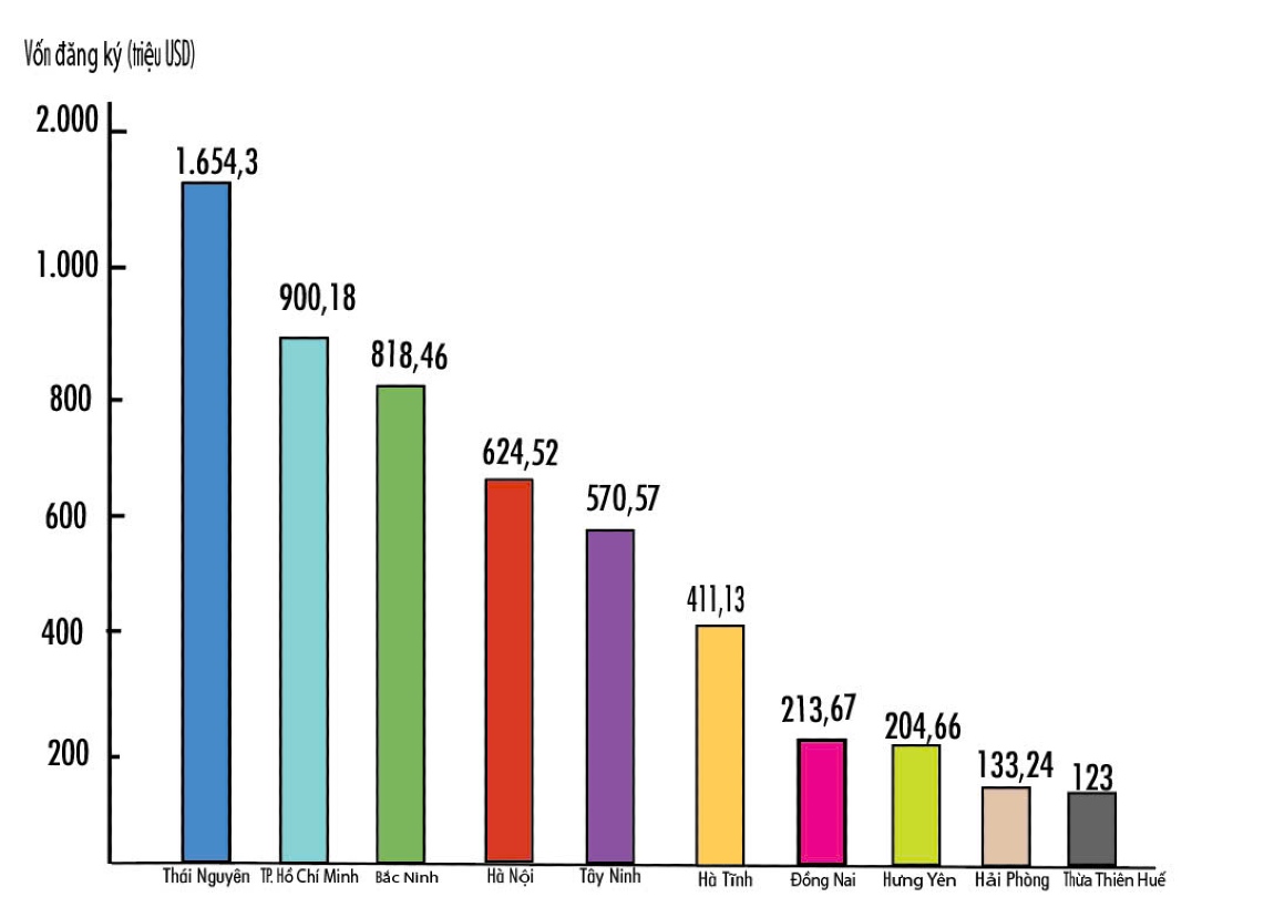 | Thái Nguyên dẫn đầu cả nước về vốn đăng ký FDI (Nguồn số liệu: Cục Đầu tư nước ngoài -FIA) |