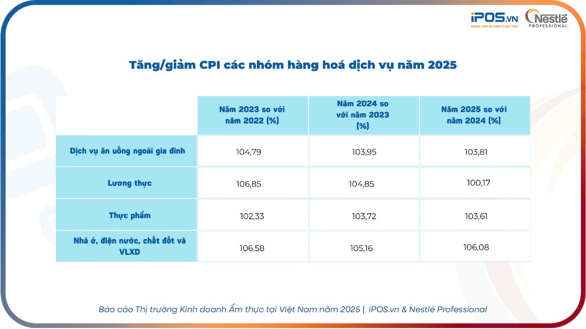 Sự chênh lệch tăng trưởng giữa các nhóm không chỉ đến từ chiến lược, mà còn bị khuếch đại bởi áp lực chi phí. Báo cáo thị trường Kinh doanh Ẩm thực Việt Nam năm 2025 chỉ ra rằng, chi phí nguyên vật liệu, nhân sự và mặt bằng đều tăng trong bối cảnh chỉ số giá tiêu dùng (CPI) tăng 3,31%, riêng nhóm ăn uống tăng 3,27%.