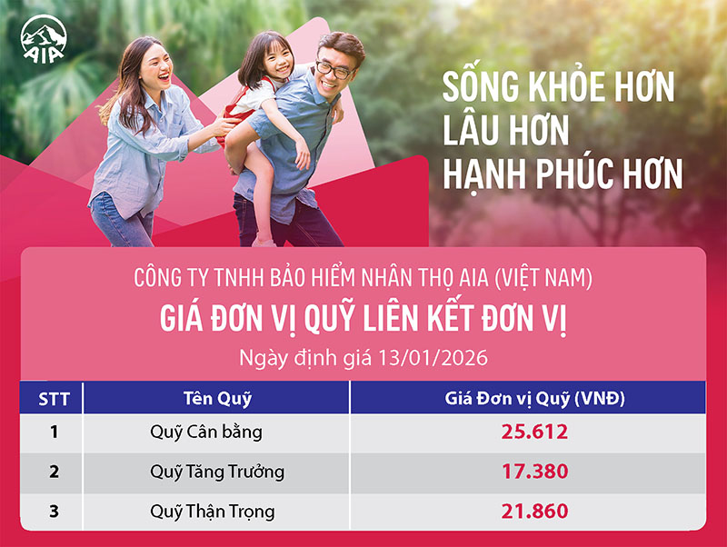 AIA Việt Nam cập nhật giá đơn vị Quỹ liên kết đơn vị ngày 14/1/2026.