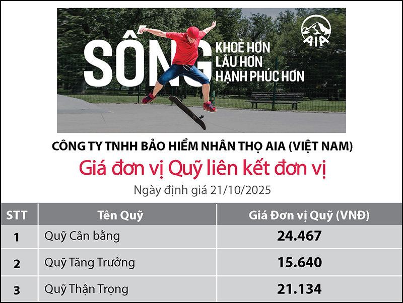 AIA Việt Nam cập nhật giá đơn vị Quỹ liên kết đơn vị ngày 22/10/2025.