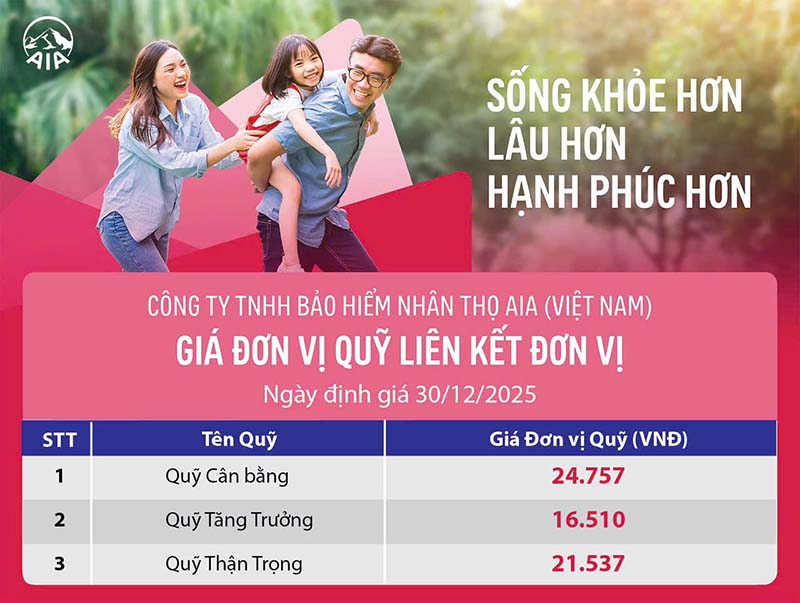 AIA Việt Nam cập nhật giá đơn vị Quỹ liên kết đơn vị ngày 31/12/2025.