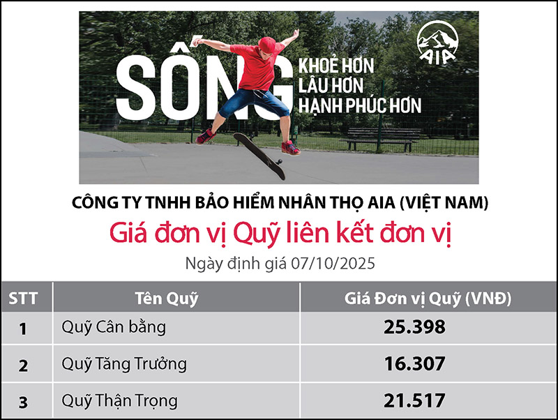 AIA Việt Nam cập nhật giá đơn vị Quỹ liên kết đơn vị ngày 8/10/2025.