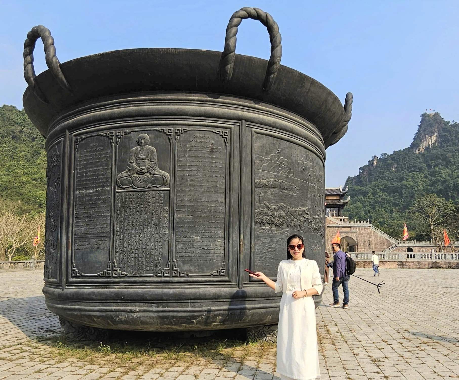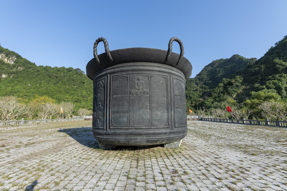 | Đại diện Ban quản lý khu Đàn Kính Thiên chia sẻ, chiếc vạc đồng khổng lồ được đúc để tôn xưng Thiền sư Nguyễn Minh Không. Ảnh: Thái Bá |